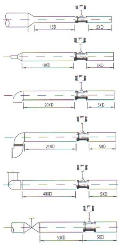 若傳感器安裝點的上游有90°彎頭或下形接頭,傳感器上游應有不小于20D的等徑直管段,下游應有不小于5D的等徑直管段,