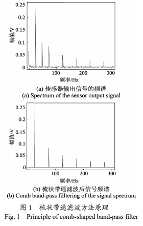 我們對采集到的實際傳感器輸出信號進行頻譜分析后發現其頻譜范圍較寬,不僅含有明顯的基波和奇次諧波分量,在其他分量處也有值,如圖1(a)中所示的在0頻率分量處的直流漂移和50Hz頻率分量處的工頻干擾等。針對輸出信號的這種特點,采用梳狀帶通濾波器,該濾波器能保留特定的頻率分量,而抑制其他的頻率分量。這樣,如圖1(a)所示的傳感器輸出信號經過梳狀帶通濾波器后,有用的基波和奇次諧波分量將通過濾波器,而其他分量將被大幅度的抑制,濾波后的信號頻譜如圖1(b)所示,可以較大程度地抑制噪聲的影響。