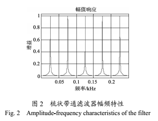 要實現上述信號處理方法,要求所設計的濾波器對勵磁頻率的奇數倍的頻率分量處的增益為1,而其他頻率分量則被大幅度的削弱。其幅頻特性曲線如圖2所示。