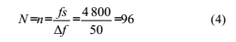 由頻譜特性可知,該濾波器相當于多個通帶帶寬很窄的帶通濾波器的聯合,形狀上很像一把梳子。由式(2)可知,所要保留的基波和所有奇次諧波分量在0~fs范圍內是均勻分布的。因此,所要求的帶通濾波器的個數n為fs除以需要保留的頻率點之間的間隔,即n=fs/△f。n必須為整數,所以選擇的采樣頻率必須為間隔△f的整數倍。當傳感器輸出信號為fo=25Hz,采樣頻率為4.8kHz時,△f=2fo=50Hz。