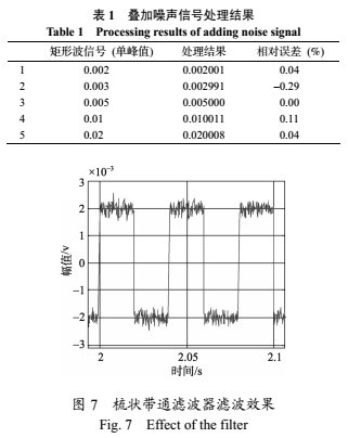 *先采用MATLAB產生上述疊加噪聲的信號,信號的頻率為25Hz,矩形波單峰值范圍為0.002~0.02,疊加上噪聲干擾后的信噪比范圍在-10.9dB~9.1dB。對產生的信號進行梳狀帶通濾波,然后進行幅值解調,取進入穩態后的計算結果與準確值進行比較,得到的結果如表1所示,此時濾波器的帶寬b=1Hz。對圖6中的含噪聲信號的處理效果如圖7所示。