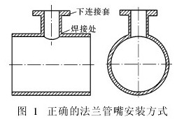在管道開孔安裝取壓短管時,焊接取壓短管應注意垂直方向,要求焊接后短管軸線與管道軸線夾角為90b,且法蘭短管連接的延長線垂直通過管道橫截面的圓心,這樣能保證流體與磁場垂直,見圖1