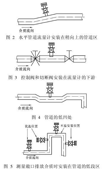 為了保障測量精度,傳感器應避免在容易產生真空、氣體、渦流等地方安裝,傳感器與智能變送器之間的通訊電纜要避開電動機等強電設備。建議安裝在圖2~圖5所示位置。