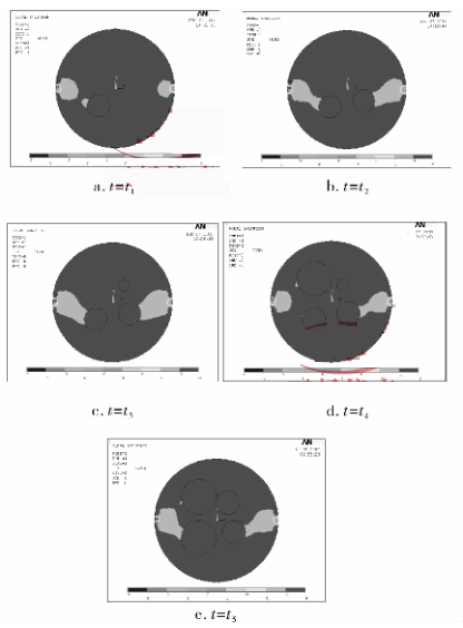 筆者探討在一體式電磁流量計徑向截面位置開始出現油氣泡時一體式電磁流量計感應信號的響應情況。在仿真模型中,設定這樣一個過程,在連續時刻 t 1 、t 2 、t 3 、t 4 ,流量計電*位置的徑向截面上分別開始出現一個油氣泡(非導電物質),在 t 5 時刻出現的4 個油氣泡的半徑變大。在這一過程中,研究非導電物質(油氣泡)的增加與變化對流量計輸出信號的影響情況;這一過程中,流體中的含水率也在變化,同時研究含水率對流量計的影響情況。圖 1 所示為流量計截面中油氣泡(非導電物質)增加與變化時的 Ansys 仿真圖,圖 1a ~ e 中分別顯示的是 t 1 ~ t 5 時刻虛電流 x 方向分量的 An-sys 圖。