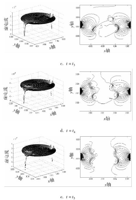 對 Ansys 仿真實驗數據通過 Matlab 進行結果分析。圖 2a ~ e 分別為 t 1 ~ t 5 時刻流體中存在油氣泡流量計測量區域虛電流在 x 方向上的分布圖及其等勢圖。從圖中可以看出:當流體中油氣泡增加時,流量計測量區域的敏感場發生變化,且流體中油氣泡越多,對流量計測量區域敏感場影響越大。為了更客觀地反應這種現象,下面運用敏感場靈敏度 c 進一步進行研究。