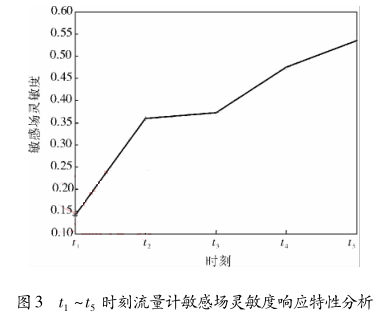 為了清晰地獲得以上 5 種情況下油氣泡對流量計虛電流分布的影響,運用敏感場靈敏度來刻畫非導電物質在不同情況下對流量計敏感場靈敏度的響應特性。圖 3 所示為以上 5 種多個非導電物質存在情況對流量計敏感場靈敏度響應特性分析。從圖3中可以看出,隨著非導電物質的個數在流體中的增加,流量計敏感場靈敏度也不斷增加,說明對一體式電磁流量計的輸出信號的影響也越大。圖 3 中 t 3 時刻敏感場靈敏度 c 較 t 2時刻增加較小,這是 t 3 時刻增加的油氣泡較小,而在 t 1 ~ t 5時刻增加的油氣泡較大時,流量計敏感場靈敏度 c變化較大,說明流體中出現較大的油氣泡對流量計測量影響較大。