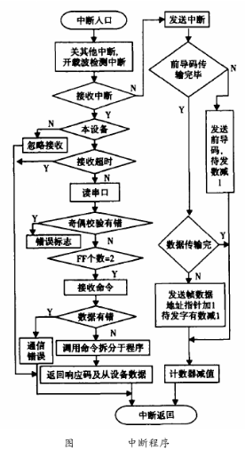 在HART通信中,智能法蘭式電磁流量計作為從設備進行通訊,所以這里的軟件設計只是針對于從設備。HART通信采用水平和垂直校驗的方法。當檢測到接收數據有差錯時,則等到主設備命令幀發完后,通知主設備數據接收有誤。主設備則重新發命令幀,從而保證通信的準確可靠。HART中斷子程序流程圖如圖6所示。由于HART通信為主從方式,HART幀中每個字節在物理層傳輸需要9ms左右,為了保證通訊的實時性,通訊程序采用串行口終端接收/發送。該中斷所要完成通信中的主要任務,即接收和發送幀,幀的拆分和打包。