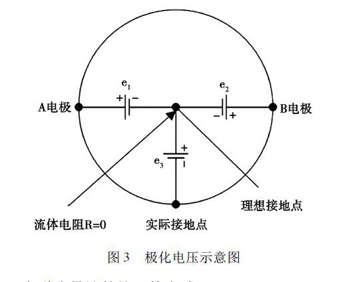 在被測(cè)液體與電*和接液部件接觸過(guò)程中,電解質(zhì)中的正負(fù)離子會(huì)分別作定向運(yùn)動(dòng),這會(huì)使被測(cè)液體在電*和接液部件之間形成電位差,通常將這種現(xiàn)象稱(chēng)為*化現(xiàn)象。如圖3 所示,理論上來(lái)說(shuō),兩電*A 和B 對(duì)接液部件的電位e1、e2大小相等、方向相反,此時(shí)兩電*的電位差等于零。但是,若兩電*的材質(zhì)或表面狀態(tài)存在差異,此時(shí)A、B 電*之間的電位差就不為零,這就形成了*化電壓,*化電壓與共模狀態(tài)的電壓e3一起疊加在流量信號(hào)中,被輸入轉(zhuǎn)換器的差動(dòng)放大器。當(dāng)*化電壓過(guò)大,則會(huì)對(duì)差動(dòng)放大器的輸入端造成較大影響,導(dǎo)致信號(hào)無(wú)法放大或流量信號(hào)的輸出波動(dòng)過(guò)大,從而降低了管道污水電磁流量計(jì)的測(cè)量精度。