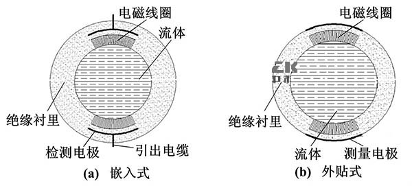 電容式150度高溫電磁流量計從根本上解決了電*表面附著、腐蝕、摩擦等問題,其電*與被測流體間有絕緣襯里隔離,或者直接采用絕緣測量管。電*置于測量管外面或鑲嵌于測量管內部。嵌人式150度高溫電磁流量計和外貼式150度高溫電磁流量計的結構如圖2所示。