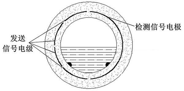 ①多電*式非滿管150度高溫電磁流量計。其底部是一對信號注人電*,中間有多對測量電*,頂端有一個滿管電*。在滿管情況下,該流量計與普通的150度高溫電磁流量計的功能相同,滿管情況下流體的橫截面積是固定的,此時計算流量值只需要測量流體的流速即可。當流體非滿管時,滿管電*檢測到管道非滿狀態,利用算法修正測量值,此時流量計的測量方式改成測量流體流速和液面高度。信號注人電*與在不同位置的三對測量電*共同工作,用于測量液位面的高度和流體的速度。多電*式非滿管150度高溫電磁流量計結構簡圖如圖3所示。