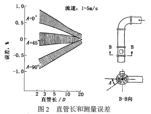 流體流過(guò)彎管后,下游產(chǎn)生流速分布畸變,若是兩只鄰近相接的不同平面彎管,除流速分布畸變外還會(huì)有漩渦。這些現(xiàn)象要影響裝在下游的大部分類(lèi)型流量?jī)x表(除容積式等少數(shù)類(lèi)型外)的測(cè)量值,因此通常要求在流量?jī)x表安裝點(diǎn)之前有一定長(zhǎng)度直管段,改善進(jìn)入儀表的流動(dòng)狀況。水廠流量計(jì)受彎管影響較小,直管長(zhǎng)度要求也遠(yuǎn)低于節(jié)流差壓式、渦街式等其他流量?jī)x表。但是當(dāng)前水廠流量計(jì)精度為測(cè)量值的0.5%,甚至0.2%~0.4%,即使影響量較小,還是受到人們的關(guān)注。