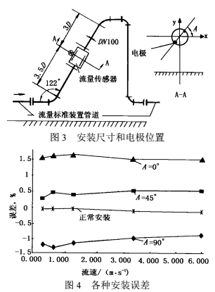 除儀表前直管段可降低彎管影響外,人們還從安裝方式上設(shè)法降低影響的方法。文獻(xiàn)曾報(bào)道電磁流量傳感器電*軸線與鄰近彎管平面成45°傾斜安裝可以減少?gòu)澒苡绊憽H毡竟I(yè)標(biāo)準(zhǔn)B7554“解說(shuō)部分”列有電*軸線與彎管平面垂直、平行、成45°三種安裝方式,在不同長(zhǎng)度直管下的測(cè)量誤差范圍,也說(shuō)明這一效果。