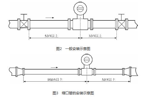 砂漿流量表的安裝質量對其測量結果的影響較大,因此在安裝時需要注意幾個問題。*先,砂漿流量表直管段的選擇在配管時一定要按照要求進行選擇,一般選擇流量計通徑與工藝管道通徑相同,即可滿足工程需要,而且安裝方便、壓力損失小,流量計直管段上游側的長度不少于5倍工藝管道直徑,下游側的長度不少于3倍工藝管道直徑(圖2)。但在流速太慢而又要求精度較高或需要變徑的應用場合,可選擇通徑小于工藝管道通徑的流量計,以提高測量精度,此時流量計上、下游必須加裝異徑管,且進口異徑管上游側應有長于10倍工藝管道直徑的直管段,下游側應有長于5倍工藝管道直徑的直管段(圖3)。