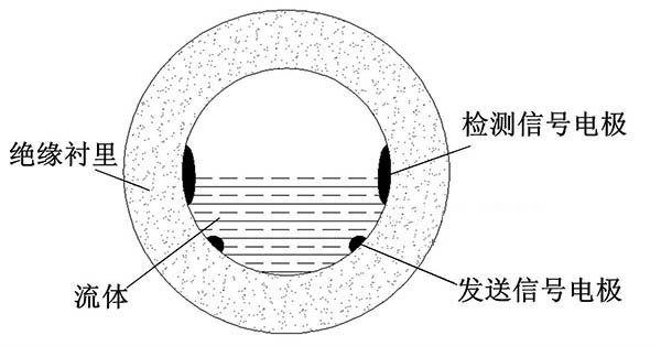 ③利用阻抗或信號衰減研制的非滿管化工原料流量計。這種結(jié)構(gòu)的非滿管化工原料流量計是當(dāng)前國內(nèi)研究的方向之一。其結(jié)構(gòu)是流量管底部貼一對信號發(fā)射電*,在流量管中間貼信號接收電*。由于信號在流體中傳播會產(chǎn)生衰減,且傳播時間越長,衰減越多,因此通過信號接收電*接收到的信號衰減量即可得知液面高度;同時該電*還能測量流體切割磁感線產(chǎn)生的電動勢,以此達到測量非滿管流量的目的。阻抗式或信號衰減非滿管化工原料流量計結(jié)構(gòu)簡圖如圖5所示。