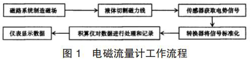 智能電磁流量計(jì)的產(chǎn)生主要是基于法拉*電磁感應(yīng)定律。在智能電磁流量計(jì)的應(yīng)用中,磁路系統(tǒng)會(huì)在流量計(jì)運(yùn)行過(guò)程中逐步出現(xiàn)直流磁場(chǎng)與交流磁場(chǎng),該磁場(chǎng)的產(chǎn)生為后期的測(cè)量提供了良好的前提條件,營(yíng)造了測(cè)量所需的磁場(chǎng)環(huán)境,因此,在智能電磁流量計(jì)應(yīng)用時(shí),一旦被測(cè)液體在導(dǎo)管中經(jīng)過(guò)該磁場(chǎng)環(huán)境時(shí),必然會(huì)產(chǎn)生一定的切割磁力線運(yùn)動(dòng),在這種情況下,電*傳感器就會(huì)發(fā)揮其作用,將導(dǎo)管內(nèi)的流量轉(zhuǎn)換為感應(yīng)電勢(shì)信號(hào),隨后此轉(zhuǎn)換形成的信號(hào)逐步被傳遞給轉(zhuǎn)換器。而轉(zhuǎn)換器更是可以將所獲得的流量信號(hào)等加以處理,通過(guò)分析、對(duì)比等,轉(zhuǎn)換器會(huì)將該信號(hào)變?yōu)闃?biāo)準(zhǔn)信號(hào),隨后將該信號(hào)輸出給積算儀,進(jìn)一步進(jìn)行信號(hào)的處理,這些處理以后的信號(hào)*終會(huì)在智能電磁流量計(jì)的儀表中顯示,呈現(xiàn)*終的流量測(cè)量結(jié)果,其基本的流程如圖 1 所示。