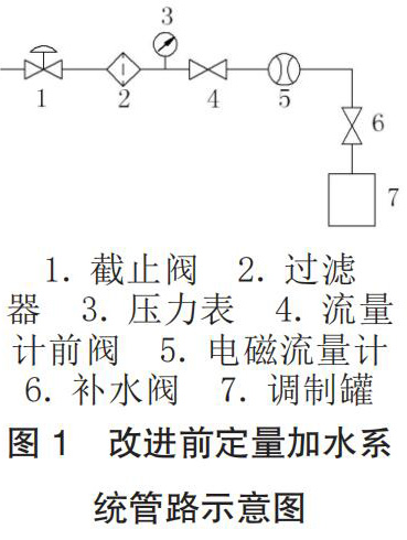 工廠的香料廚房系統為國內煙機公司 2004 年設計制造,其定量加水系統主要由水源、JKM-LDE電磁流量計、加水管路元件和控制程序這四部分組成,改進前管路示意圖如圖 1 所示。