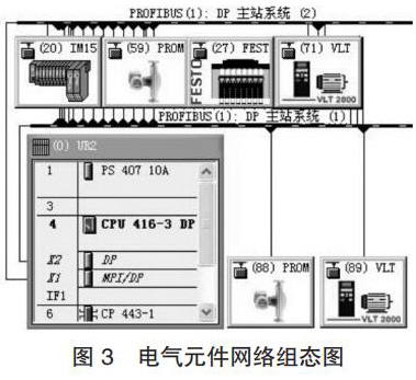 (1)電氣元件組態。把增加的質量流量計和變頻器添加到香料廚房 S7-400 PLC 控制系統的 PROFIBUS 網中,其網絡組態如圖 3 所示,圖中 PROFIBUS-DP 地址 88 和 89 為硬件系統增加的質量流量計和變頻器。