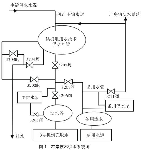 技術供水系統設有主、備用水源。主水源是蝸殼取水,作為機組技術供水的主用水源。備用水源有兩個,一個是設在 1 號機段的壩前取水,取水口高程為 145m,另一個是同 4 號機組蝸殼取水共用取水口的蝸殼備用取水。兩路備用水源均接到備用總水管,并通過 X207 閥分別與各臺機組的技術供水系統相連通(見圖 2)。
