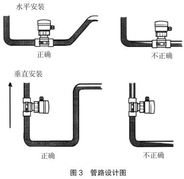 現場安裝時應注意遠離可能對其產生干擾的大型設備,防止長期的熱輻射和其他如磁場直射等環境影響。為確保高測量精度和較好的零點穩定性,進行校正前,二次供水流量計應裝入工藝介質中至少 24 小時電*鈍化。安裝的管路設計應確保管道始終充滿流體,防止測量誤差,管路設計圖見圖 3。