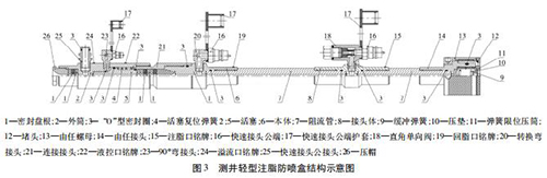 綜上所述,結合普通防噴裝置和 DLFP14 - 70T 注脂防噴裝置的結構特點,研究設計輕型注脂防噴裝置。如圖 3 所示,輕型注脂防噴盒有 1 個注脂口、1個回脂口、1 個防噴盒液控口、及 1 個溢流口,主體內裝有 2 根阻流管,但阻流管沒有護管。輕型注脂防噴盒采用 3 級密封: * 1 級密封采用注脂密封,注脂泵從注脂口注入高壓高粘度密封脂于 2 根阻流管與電纜間隙; * 2級密封采用液壓密封,手壓泵補加壓結合從防噴盒液控口注入液壓油,推動活塞擠壓膠芯壓筒; * 3 級密封采用壓帽、橡膠盤根和鋼墊。輕型注脂防噴裝置。與 DLFP14 - 70T 注脂防噴裝置比較: 沒有液控上、下捕捉器和液控防噴器; 液壓密封采用手壓泵; 注脂泵采用小型氣動液壓泵; 防噴盒沒有刮纜器密封和刮油部分; 阻流管壁厚加厚,沒有護管。輕型注脂防噴裝置工作壓力 21 MPa,耐壓 42 MPa。