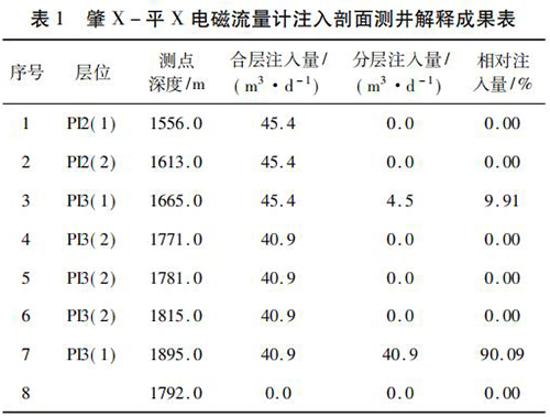 2017 年 9 月在大慶油田采油八廠肇 X - 平 X 水平井注水井中*次進(jìn)行了水平井注入剖面測井現(xiàn)場試驗(yàn)。該井斜深2 055. 42 m,水平段長度為568. 46 m,試驗(yàn)?zāi)康氖峭ㄟ^注入剖面測井了解該井各層段的注水情況,同時(shí)對水平井測井工藝、儀器的適用性、井下牽引器及井口輔助裝置等設(shè)備的工作有效性和可靠性進(jìn)行評價(jià)。現(xiàn)場試驗(yàn)中,在密閉條件下錄取到了該井的注入剖面測井資料,進(jìn)行了重復(fù)測量,重復(fù)測量結(jié)果在誤差允許范圍內(nèi),測井成果見表 1。該井施工壓力 6. 0 MPa,注入量45. 4 m3 /d,有 7 個射孔層,分 8 個測點(diǎn)測量,2 個層有吸入顯示,其中,P13( 1) ( 1 734 ~ 1 767 m) 層絕對吸入量4. 5 m3 /d,相對吸入量為9. 91 %,P13( 1) ( 1 899 ~1 943 m)層絕對吸入量 40. 9 m3 /d,相對吸入量為 90. 09% ,測井成果見表 1。通過與甲方的交流,再結(jié)合該井的動靜態(tài)資料及周圍井的工作狀況,采油廠的地質(zhì)人員認(rèn)為本次測井結(jié)果能比較準(zhǔn)確地反映該井的注入情況。