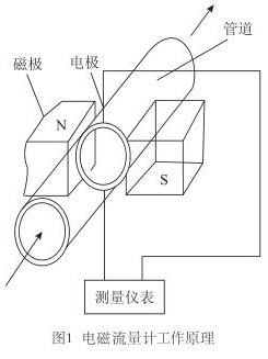 廢水流量表是應用電磁感應定律,即:導電體在磁場中運動產生感應電動勢,而感應電動勢又和流量大小成正比,通過測電動勢來反映管道流量的原理而制成的,用來測量導電流體的體積流量(見圖1)。工業上多用以測量水、礦漿、各種酸、堿、鹽等腐蝕液體等介質的流量。