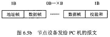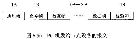 在硫酸流量表等節(jié)點(diǎn)設(shè)備和C機(jī)通信的過程中,由地址幀、命令幀、數(shù)據(jù)幀、校驗(yàn)和可組成各種功能不同的報(bào)文。由于采用主從工作方式來實(shí)現(xiàn)通信,硫酸流量表等節(jié)點(diǎn)設(shè)備僅能接收并執(zhí)行PC機(jī)發(fā)送來的控制命令,而不能發(fā)送命令給PC機(jī)。因此,由PC機(jī)發(fā)往流量計(jì)等節(jié)點(diǎn)設(shè)備的報(bào)文一般包括一個(gè)地址幀,一個(gè)命令幀,若干個(gè)數(shù)據(jù)幀和一個(gè)校驗(yàn)和,其報(bào)文格式圖.6a5所示;而由流量計(jì)等節(jié)點(diǎn)設(shè)備發(fā)往PC機(jī)的報(bào)文一般包括一個(gè)地址幀,若干個(gè)數(shù)據(jù)幀和一個(gè)校驗(yàn)和,其報(bào)文格式如圖6.5b所示。