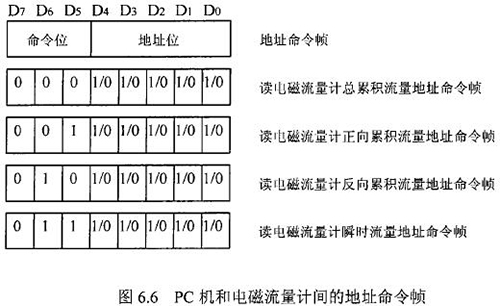 由于RS一485電氣標(biāo)準(zhǔn)規(guī)定每段只能聯(lián)結(jié)犯?jìng)€(gè)節(jié)點(diǎn)設(shè)備,因此可用地址幀中五個(gè)二進(jìn)制位表示這32個(gè)地址,其余3位用來表示命令,從而構(gòu)成地址命令幀。對(duì)于控制命令需求不超過八個(gè)的通信系統(tǒng),采用地址命令幀可壓縮報(bào)文長(zhǎng)度提高通信效率。在污水網(wǎng)絡(luò)監(jiān)控系統(tǒng)中,硫酸流量表和PC機(jī)通信的主要目的是將流量計(jì)中的有用數(shù)據(jù)讀到PC機(jī)中。這些數(shù)據(jù)包括:總累積流量、正向累積流量、反向累積流量、瞬時(shí)流量。通信時(shí),PC機(jī)只需向硫酸流量表發(fā)送讀總累積流量、讀正向累積流量、讀反向累積流量、讀瞬時(shí)流量命令即可,因此二者間通信所用的地址幀和命令幀可合二為一,用一個(gè)地址命令幀代替。PC機(jī)和硫酸流量表間的地址命令幀定義如圖.66所示。根據(jù)污水網(wǎng)絡(luò)監(jiān)控系統(tǒng)中PC機(jī)與硫酸流量表間通信的特殊性,二者通信所使用的報(bào)文可簡(jiǎn)化為圖.67的格式。