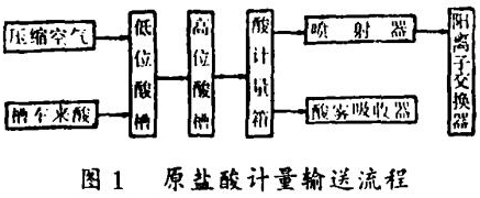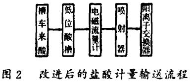 該系統工藝復雜,操作困難,安全性低,在一次向高位酸槽壓送濃鹽酸的過程中,曾發生過鹽酸噴出傷人的事故。因此對整個系統進行了改進(見圖2)