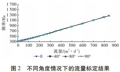 為了考察井眼斜度變化對石灰水流量計量表測量流量的影響,開展了非集流石灰水流量計量表在不同斜度情況下的流量測量模擬實驗。模擬實驗在大慶油田多相流實驗室進行,儀器外徑 38 mm,模擬井筒內徑為 124 mm,實驗介質是水,傾斜角度分別為 0°、40°、80°和 90°( 水平) ,流量范圍為 5 ~ 850 m3 /d。實驗結果表明,在儀器居中條件下,井眼斜度變化對石灰水流量計量表的儀表常數沒有影響,滿量程誤差不大于 4% ,因此可以應用石灰水流量計量表進行水平井注水剖面測量。不同角度情況下的實驗結果如圖 2 所示。