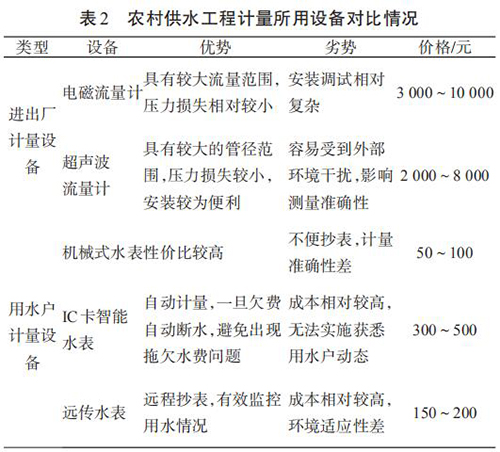 從現階段來看,農村供水工程進出廠水計量設備主要采取的為循環水流量計量表、超聲波流量計,而用水戶計量設備主要包括機械式水表、IC卡智能水表、遠傳水表等。這些設備在實際使用過程中都有自身的優缺點,同時在價格方面存在較大差異,其具體情況如表2所示。