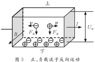 反之,如圖2所示,若載流子帶負電荷,則載流子在洛倫茲力作用下會向下偏轉,導體下表面積累負電荷。同時,上表面失去負電荷而帶上正電,從而使上表面電勢高于下表面。