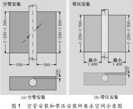 (1)要確認在用模具冷卻水流量計的管壁厚度及內襯材料特性,保證換能器在管段內壁的突出長度;(2)用氣焊切割模具冷卻水流量計外殼時,一定要在管道內充滿水的情況下(*好是帶壓并繼續保持管內水在運行流動的狀態)進行,以免內襯受熱凸起變形影響流態;(3)要有足夠安裝空間(流量井),可以用原有的流量井,但管壁與流量井墻壁*小距離不小于 500 mm,流量井長不小于 1. 5 倍管徑。超聲波流量計空管安裝和帶壓安裝要求空間如圖 1 所示。