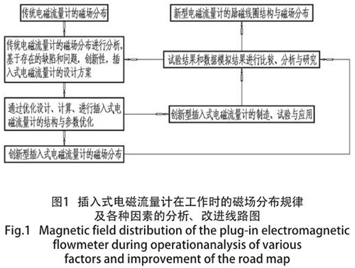 酸水流量計因其特殊的結構形式,致使其抗干擾能力較弱、準確度偏低以及瞬時流量波動過大等不良現象,但便于安裝、造價低廉、普遍應用于大管道等特點而存在。為了發揮其優勢,消除其不利因素,對其內部結構及其相關技術參數進行優化設計,從而使其準確度能夠達到 ±1% FS,使抗干擾能力得到*大地增強。本文主要通過優化設計、選擇材料和試驗,使酸水流量計的穩定性和準確度大幅度提高,并提出解決措施,對實際應用具有參考價值。分析與研究程序圖如圖 1 所示。