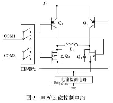 由圖 3 可知,I o 為高低壓切換恒流控制電路輸出的恒流源電流,H 橋驅動的 COM1 端控制三*管 Q 1和場效應管 Q 4 的通斷;COM2 端控制三*管 Q 2 和場效應管 Q 3 的通斷。L 1 表示的是勵磁線圈(傳感器中線圈),COM1、COM2 為正交的 PWM 波信號,因此在勵磁線圈 L 1 的兩端會產生方波勵磁信號。檢流電路主要是用來檢測勵磁線圈中電流的變化,當線圈中的勵磁電流方向變化時,可以及時將此信息反饋給高低壓切換恒流控制電路中的比較器,從而實現切換高低壓源達到恒流控制的目的。