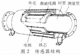 電磁流量計由流量傳感器和轉換器兩部分組成。傳感器典型結構示意如圖2,測量管上下裝有激磁線圈,通激磁電流后產生磁場穿過測量管,一對電*裝在測量管內壁與液體相接觸,引出感應電勢,送到轉換器。激磁電流則由轉換器提供。