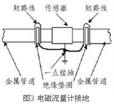 (4)盡量避開振動源、磁源(大功率電機、變壓器)由于管道水流量表的測量感應電壓很小,電壓較低,易受外界電磁噪聲的影響,故在安裝時應進行可靠的接地連(跨)接。金屬管道管道水流量表接地連(跨)接方法如圖3所示