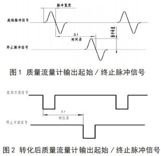 將循環(huán)水流量計(jì)流量與相關(guān)測試設(shè)備連接起來,就可以進(jìn)行循環(huán)水流量計(jì)的校準(zhǔn),時(shí)間差△ t 由專用試驗(yàn)測試設(shè)備可以測出。起始脈沖信號和終止脈沖信號如圖 1 所示。經(jīng)過專用試驗(yàn)測試設(shè)備信號轉(zhuǎn)化后的信號方波如圖 2 所示。