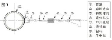 將密封墊圈放入已焊接好的底座中,再將特制球閥擰入,注意壓緊密封墊圈,防止漏水。將開(kāi)孔器密封護(hù)套與球閥外螺紋連接。擰緊后,打開(kāi)球閥,推動(dòng)鉆桿直至與管道外壁接觸,將手電鉆與鉆桿接好鎖緊,接通電源,開(kāi)始鉆孔。在鉆孔過(guò)程中電鉆保持低速,轉(zhuǎn)速不要過(guò)快、以免卡鉆,甚至鉆頭折斷。鉆透后,拔出鉆桿直到開(kāi)孔器鉆頭的*前端退至球閥芯后,關(guān)上球閥,卸下開(kāi)孔器。