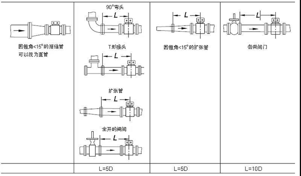 得出圖3的流速曲線有一個(gè)前提條件,就是保證流量計(jì)前后直管段的要求。為了使流過(guò)傳感器介質(zhì)流態(tài)穩(wěn)定,測(cè)量精度不受流速分布影響,通常對(duì)流量計(jì)直管段長(zhǎng)度要求上游10D、下游5D(D為原水流量計(jì)口徑),如圖4所示。直管段是從原水流量計(jì)傳感器中點(diǎn)算起,并是不很多人以為的法蘭連接處算起。