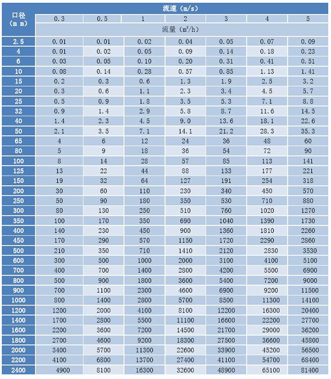 (3)流量計(jì)流速、口徑、流量對(duì)應(yīng)表