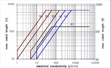 以某品*原水流量計(jì)選型樣本提供的電導(dǎo)率和電纜長(zhǎng)度曲線為例,其中A型電纜為雙芯雙屏蔽DS300、B型電纜為雙芯三屏蔽BTS300。像浙江省一般水庫(kù)原水電導(dǎo)率在100us/cm左右,安裝所需電纜線小于100米,選A型即可,超過(guò)100米,需要選B型。