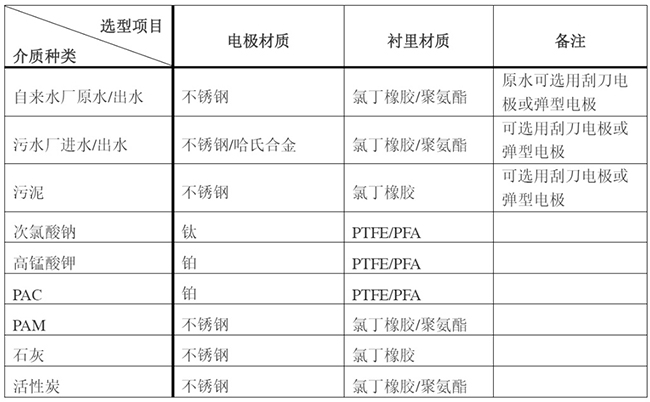 電*對(duì)被測(cè)量介質(zhì)的耐腐、抗磨蝕、無(wú)電化學(xué)反應(yīng)是選擇材質(zhì)考慮的因素。常用金屬材料有含鉬耐酸鋼、哈氏合金B(yǎng)、哈氏合金C、鈦、鉭、鉑銥合金等。由于介質(zhì)種類(lèi)繁多,其腐蝕性又受溫度、濃度、流速等復(fù)雜因素影響而變化,生產(chǎn)廠僅能給出很粗略的各種電*的適用范圍。電*材質(zhì)的選擇可從使用者借鑒該介質(zhì)在其他設(shè)備的應(yīng)用實(shí)例和以往的經(jīng)驗(yàn)來(lái)確定。浙江某自來(lái)水廠用于計(jì)量5-10%次氯酸鈉投加,電*材質(zhì)選擇了哈氏合金,在運(yùn)行使用1年多的時(shí)間后,出現(xiàn)傳感器故障,返廠檢測(cè)發(fā)現(xiàn)電*腐蝕,后我司選擇鈦電*材質(zhì),現(xiàn)運(yùn)行情況良好。水行業(yè)常規(guī)選型詳見(jiàn)表2。