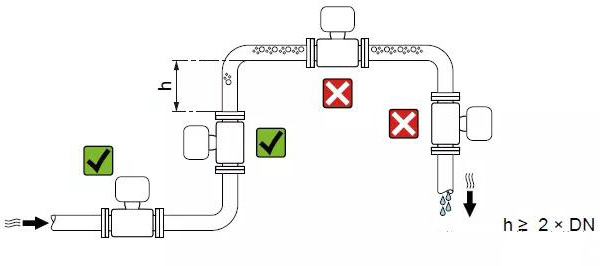 在豎直向下管道中安裝時(h ≥ 5 m (16.4 ft)),需要在傳感器的下游管道中安裝帶泄放閥的虹吸管, 避免出現低壓,以及抽壓時損壞測量管。此措施還可以防止系統的測量精度降低。