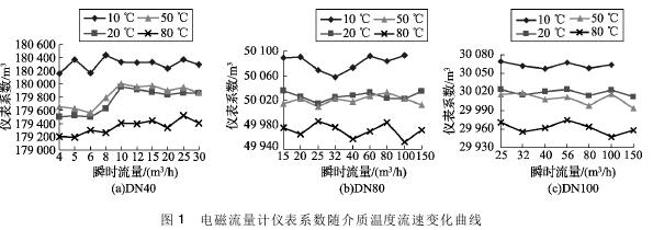 將實驗測得的粘土漿流量計在不同溫度及流速下的儀表系數數據整理,特性曲線如圖1所示,3組曲線分別對應DN40、DN80、DN100的3塊粘土漿流量計的儀表系數曲線。