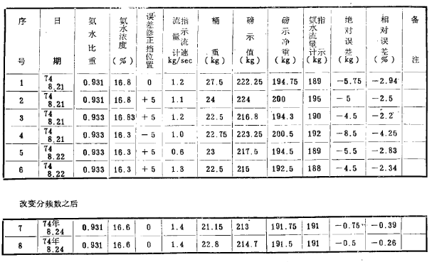 測試方法:將氨水通過流量計計量后,放入氨水桶,用磅秤稱其重量,以磅秤示數為標準,求氨水流量計之誤差。現將幾次典型實測數據列表于后: