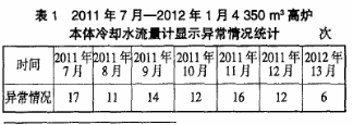 本體流量計(jì)工作平臺(tái)的煤氣濃度(全文中“煤氣濃度”均指“質(zhì)量分?jǐn)?shù)”)*小為900×10-6,一般情況為1100×10-6~1 200×10-6,*高時(shí)可達(dá)1800×10-6,而實(shí)際工作時(shí)的安全工作范圍是低于160×10-6。如此大的煤氣濃度的工作平臺(tái)使得在處理故障的過(guò)程中存在較大的安全隱患。表1是對(duì)2011年7月—2012年1月4 350m³高爐本體冷卻水流量計(jì)顯示異常情況進(jìn)行的統(tǒng)計(jì)。