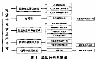 通過(guò)頭腦風(fēng)暴法對(duì)流量計(jì)顯示異常原因進(jìn)行查找,繪制系統(tǒng)圖(見圖1)來(lái)進(jìn)行原因分析。