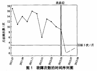 通過(guò)實(shí)施改進(jìn)措施之后,繪制2011年7月—2012年8月本體流量計(jì)故障次數(shù)時(shí)間序列圖(圖3)。圖3中圓點(diǎn)表示改造前故障次數(shù),三角形表示改造之后故障次數(shù)。由圖3可以看出,改造前故障次數(shù)全部在控制限以外;改造之后故障次數(shù)全部在控制限內(nèi),均已達(dá)到3次/月的控制目標(biāo)。