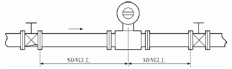 dn65一體式電磁流量計的安裝質量對其測量結果的影響較大,因此在安裝時需要注意幾個問題。*先,dn65一體式電磁流量計直管段的選擇在配管時一定要按照要求進行選擇,一般選擇流量計通徑與工藝管道通徑相同,即可滿足工程需要,而且安裝方便、壓力損失小,流量計直管段上游側的長度不少于5倍工藝管道直徑,下游側的長度不少于3倍工藝管道直徑(圖2)。但在流速太慢而又要求精度較高或需要變徑的應用場合,可選擇通徑小于工藝管道通徑的流量計,以提高測量精度,此時流量計上、下游必須加裝異徑管,且進口異徑管上游側應有長于10倍工藝管道直徑的直管段,下游側應有長于5倍工藝管道直徑的直管段(圖3)。